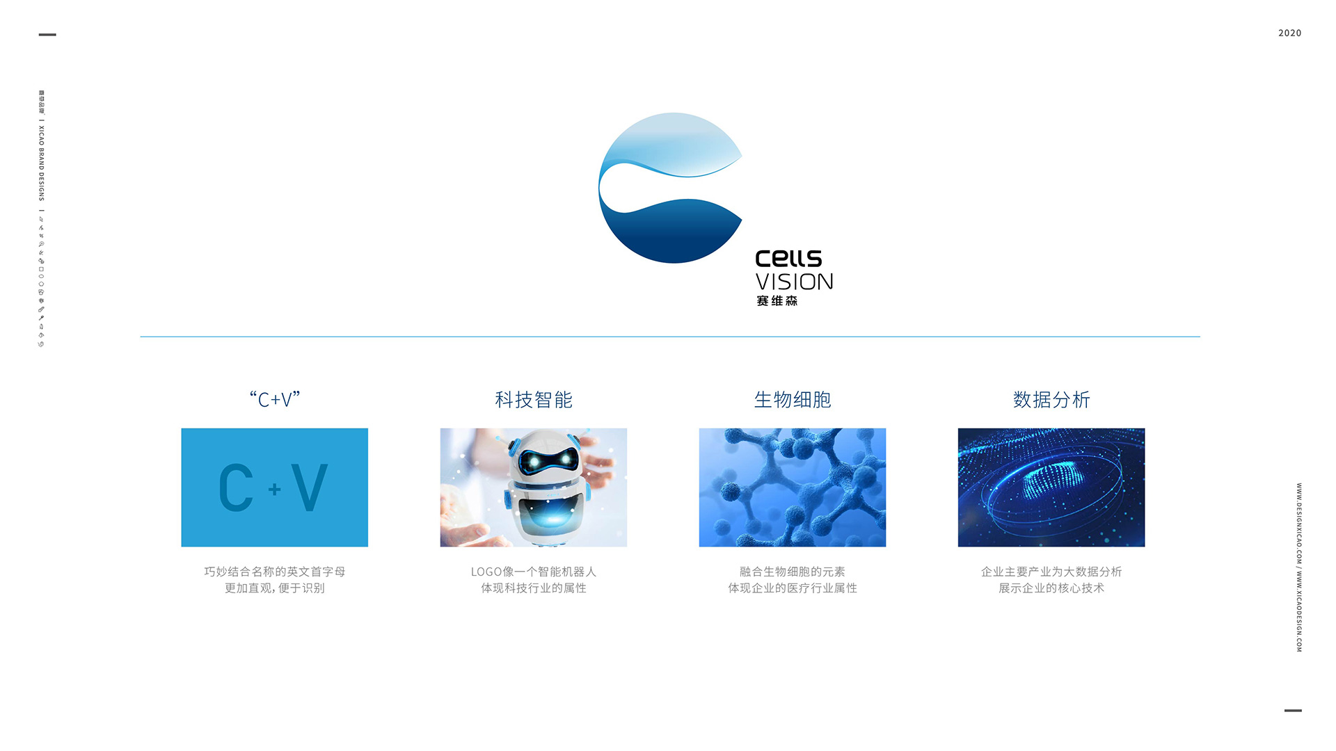 LOGO整體呈現一個充滿科技感的機器人的外觀,能夠直觀的看見英文首字母“C”和“V”,中間融合細胞的元素,體現企業的核心技術——醫療科技。